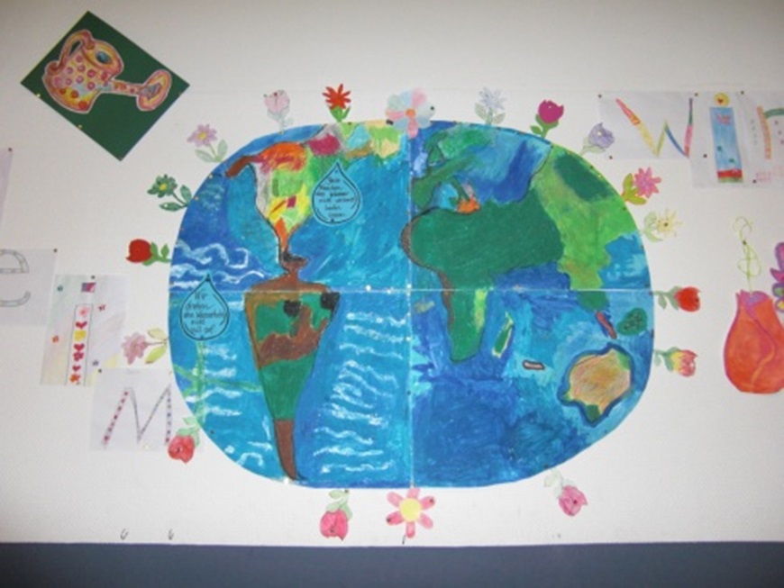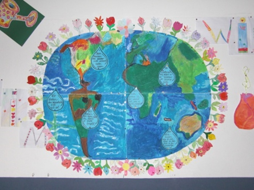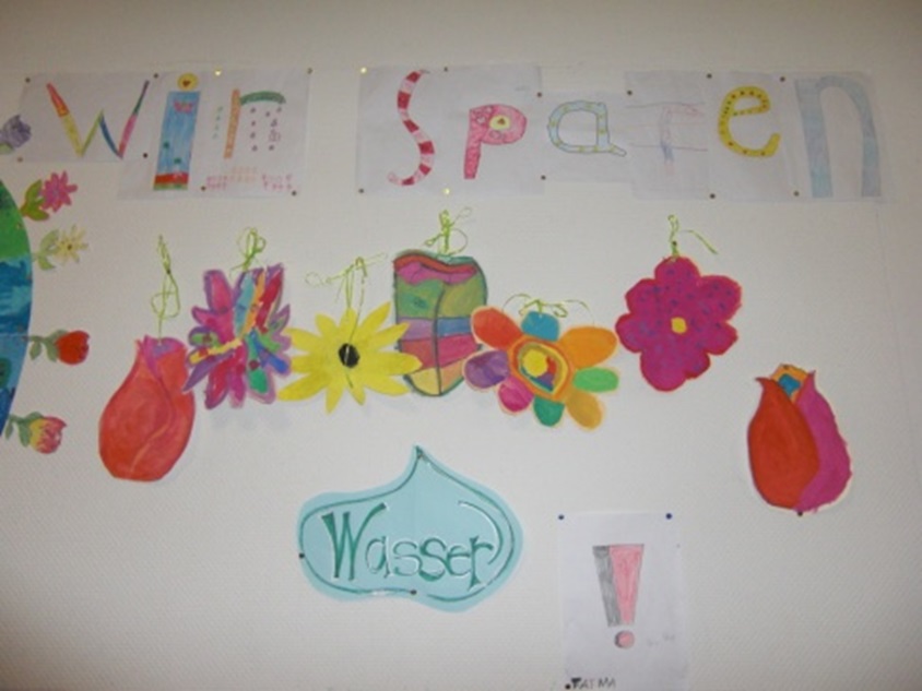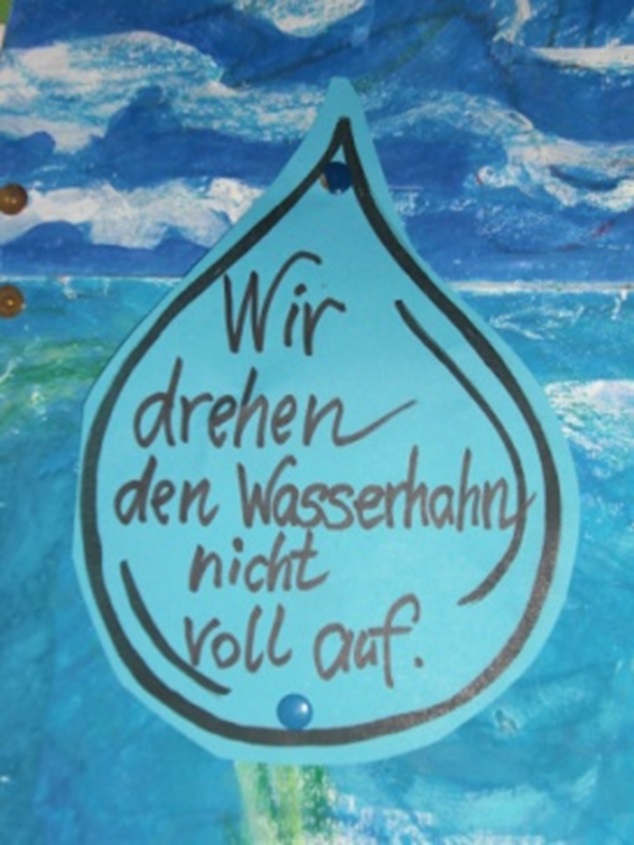 Diese Wassertropfen wurden für alle Schüler gut sichtbar auf unserem großen Umweltplakat angebracht. Dieses Plakat soll den Kindern den direkten Zusammenhang von Umweltschutz und Wassersparen verdeutlichen: Je mehr Wasser wir einsparen, desto mehr Wasser bleibt den Pflanzen - und auch den Menschen - zum Leben, unsere Welt "blüht auf".